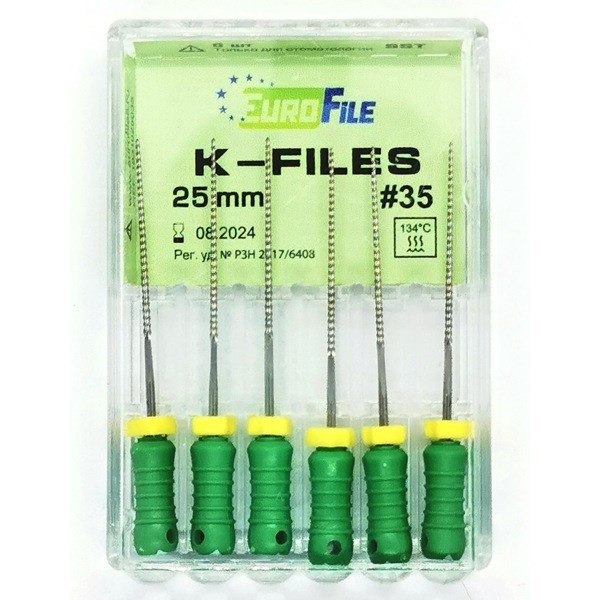 K-файлы EUROFILE изготовлены из нержавеющей стали и снабжены пластиковыми рукоятками и силиконовыми стопперами. Дрильбор ручной типа K-FILES — наиболее распространенный эндодонтический инструмент, применяемый для прохождения и расширения корневых каналов зубов. Стальные К-файлы прочные и достаточно гибкие, чтобы минимизировать риск травмирования при обработке канала.