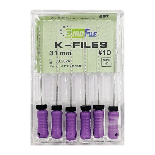 K-файлы EUROFILE изготовлены из нержавеющей стали и снабжены пластиковыми рукоятками и силиконовыми стопперами. Дрильбор ручной типа K-FILES — наиболее распространенный эндодонтический инструмент, применяемый для прохождения и расширения корневых каналов зубов. Стальные К-файлы прочные и достаточно гибкие, чтобы минимизировать риск травмирования при обработке канала.