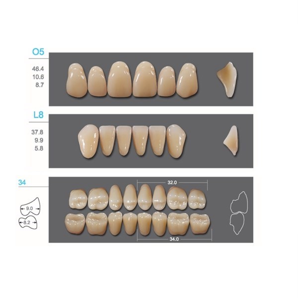 Зубы Kaifeng представлены во всех вариантах цветов по шкале Vita, а многообразие форм позволит реализовать творческий подход при изготовлении протезов. Жесткие зубы, высокая износостойкость.