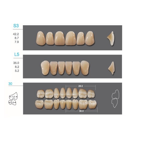 Зубы Kaifeng представлены во всех вариантах цветов по шкале Vita, а многообразие форм позволит реализовать творческий подход при изготовлении протезов. Жесткие зубы, высокая износостойкость.