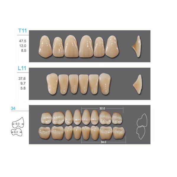 Зубы Kaifeng представлены во всех вариантах цветов по шкале Vita, а многообразие форм позволит реализовать творческий подход при изготовлении протезов. Жесткие зубы, высокая износостойкость.