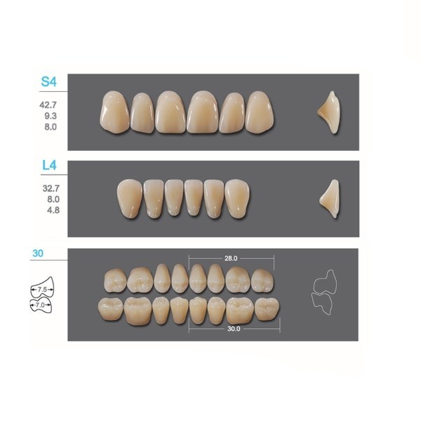 Kaili - зубы акриловые, верхние S4/нижние L4, цвет D3, размер 30, коробка 4х28 шт