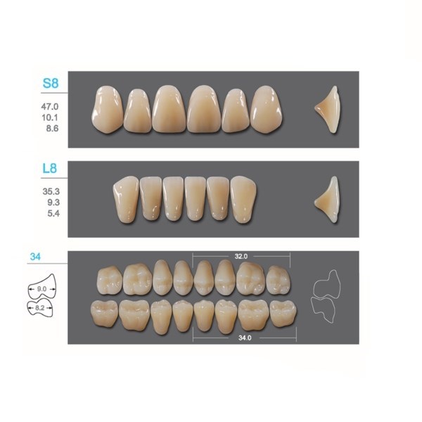 Kaili - зубы акриловые, верхние S8/нижние L8, цвет D3, размер 34, коробка 4х28 шт