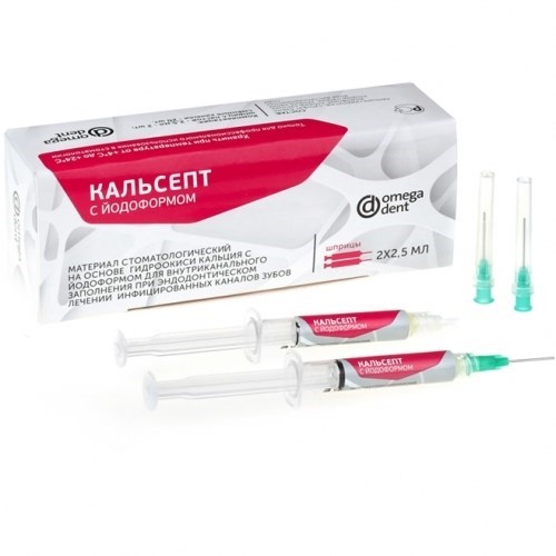 Описание: Кальсепт - Йодоформом, ОмегаКальсепт с йодоформом - материал на основе гидроксида кальция с йодоформом для заполнения корневых каналов.