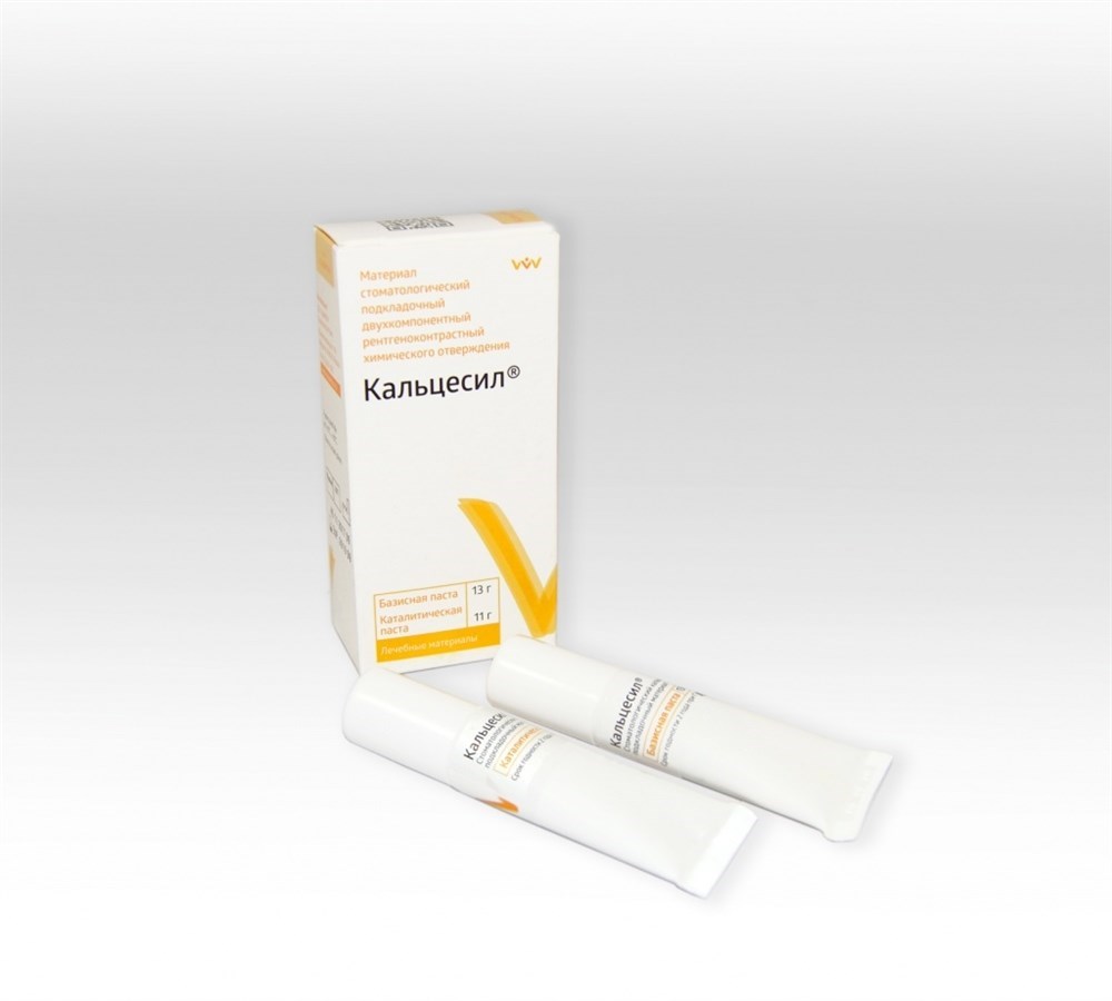 Материал «Кальцесил» двухкомпонентный (паста-паста) рентгеноконтрастный кальцийсодержащий подкладочный материал химического отверждения. Обладает высокой клинической эффективностью (стимулирует дентиногенез в процессе и после лечения зуба, восстанавливает пластические функции пульпы), содержит: