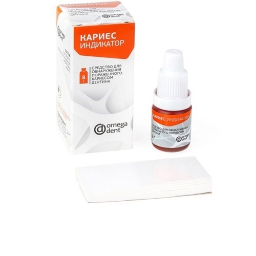 Описание: Кариес индикатор-жидкость 8мл, ОмегаКариес индикатор - средство для обнаружения пораженного кариесом дентина.