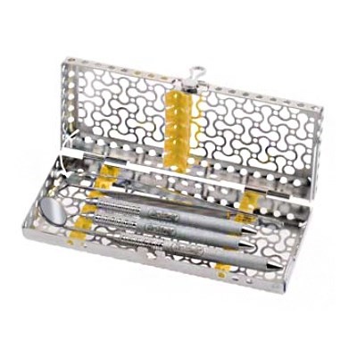 Мягкие силиконовые вставки надежно фиксируют инструменты, предотвращая их перемещение и порчу во время стерилизации. Декоративные сквозные отверстия по всей поверхности кассеты обеспечивают максимально эффективную очистку и обеззараживание инструментов.