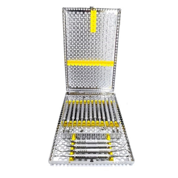 Сквозные декоративные отверстия по всей поверхности кассеты обеспечивают эффективную полноценную обработку инструментов. Мягкие силиконовые вставки надежно фиксируют использованный инструментарий, предотвращая их повреждение.