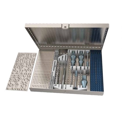 Кассета-укладка изготовлена из титана и используется для стерилизации мини, низкопрофильных, микропластин, винтов и инструментов. Благодаря своей конструкции позволяет эргономично разместить инструменты.