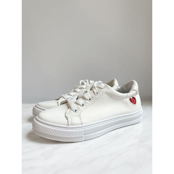 Женские кеды на шнуровке от производителя Start выполнены из искусственной кожи белого цвета. Подошва не скользит, изготовлена из полиуретана. Изюминка данной модели — красное сердце на внешней стороне обуви.