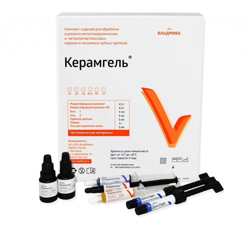 Керамгель с праймером-адгезив, омопакером, универсальным композитом «Дентлайт»(UD), композитная паста А2.