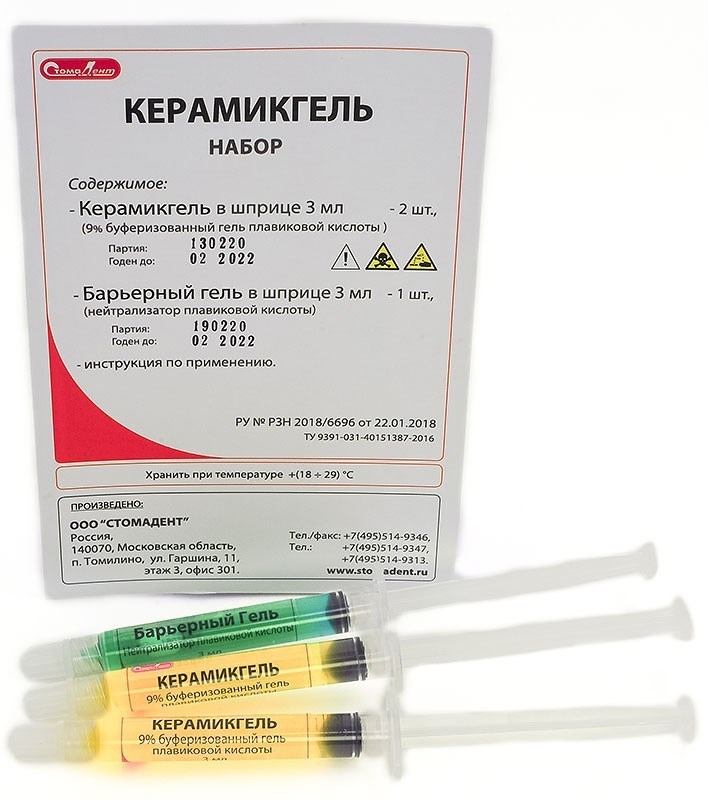 Керамикгель (9% плавиковая кислота) - 2 шпр. по 3 мл, барьерный гель - 1 шпр. 3 мл