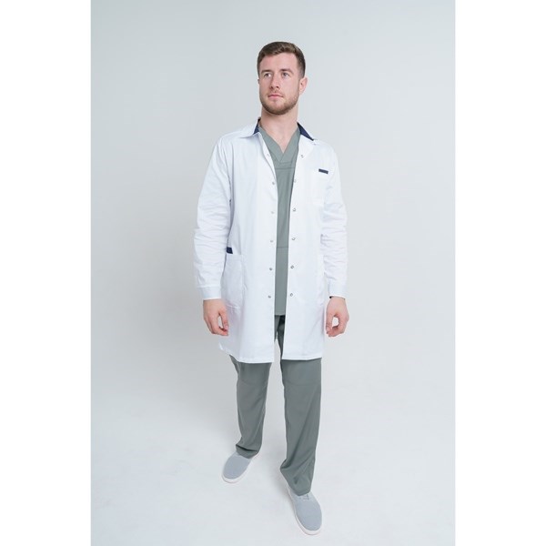 Мужской медицинский халат 165ТСД от производителя СтильБ имеет прямой крой, длинный рукав с манжетами и воротник стойку. Изделие застегивает на металлические кнопки спереди и дополнено двумя накладными карманами и одним нагрудным.