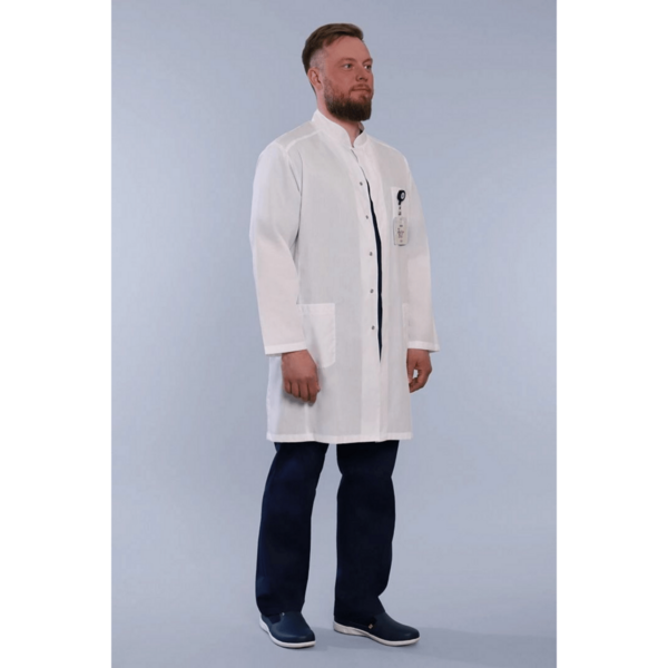 Строгий, удлиненный халат 502 прямого силуэта, с длинными рукавами, застежкой на кнопках, шлицей и полупоясами по спинке. Воротник стойка. Дополняют халат практичные и функциональные накладные карманы. А для удобного доступа к брючным карманам медицинской формы в халате предусмотрены разрезы.