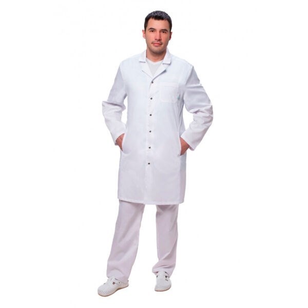 Мужской медицинский халат модели 510 имеет классический крой с воротником пиджачного типа. Модель имеет длинный рукав, длину до линии колена, один нагрудный карман и два кармана скрытых в боковых швах.