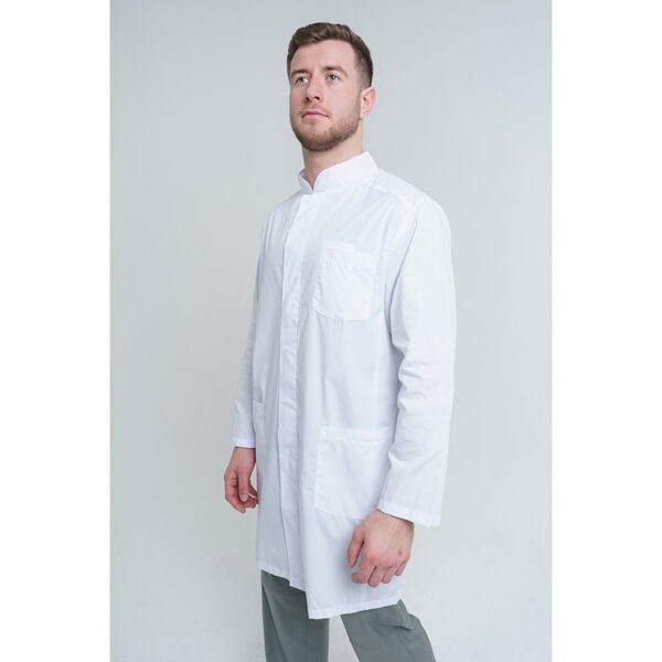 Мужской медицинский халат 68ТСД от производителя СтильБ имеет современный крой, длинный рукав с манжетами и воротник стойку. Изделие застегивает на пуговицы спереди и дополнено двумя накладными карманами и одним нагрудным.