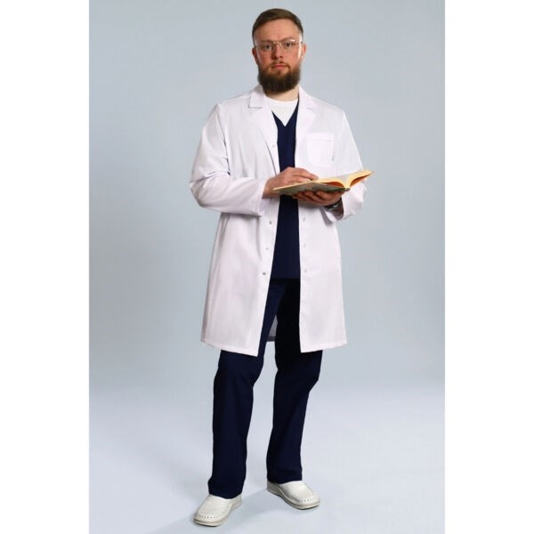 Строгий и элегантный мужской укороченный медицинский халат модель 510 прямого силуэта, с аккуратными длинными рукавами. Застегивается на эстетичные пуговицы. Полупояса по спинке и изящная шлица придадут вашей фигуре подтянутый и серьезный вид. Модель халата имеет классический отложной воротник, практичные и функциональные карманы. Данная модель подойдет для любой фигуры, так как имеет широкий размерный ряд — до 66 размера.