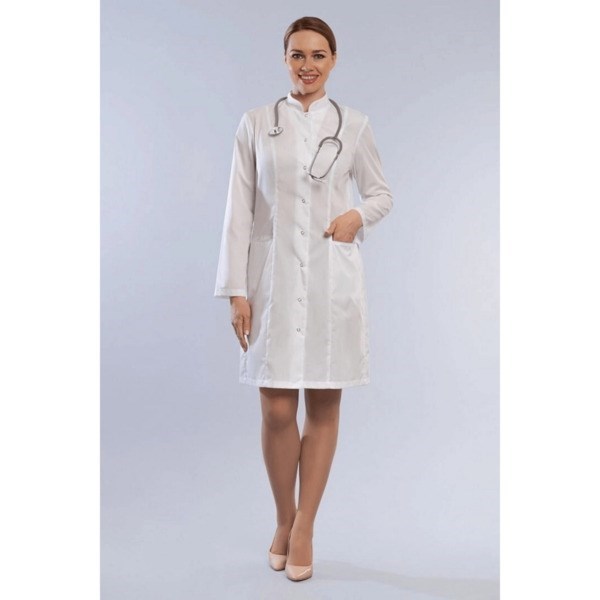 Женский медицинский халат 206 модели имеет приталенный крой выше колена и длину рукава ¾. Рельефные вертикальные швы по спинке и полочке изделия зрительно вытянут силуэт. Ярким акцентом в данной модели выступает тонкий кант. Он обрамляет воротник, манжеты рукавов и карманы. Цвет канта Вы можете выбрать по своему усмотрению. Воротник-стойка придают образу строгости и элегантности.