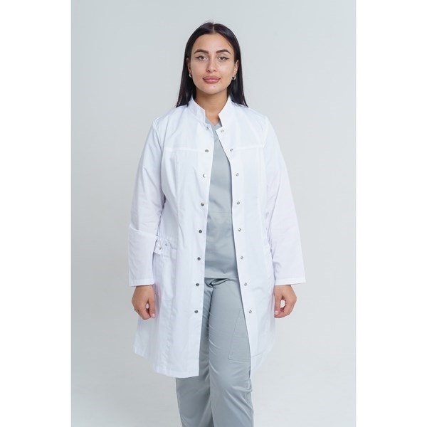 Стильный оригинальный медицинский халат 248 модели имеет изящно приталенный силуэт с длинными рукавами, воротник-стойку и гармоничную застежку на кнопках со шляпкой. Грациозные полупояса на спинке, которые застегиваются на кнопки и придают утонченность вашей фигуре.