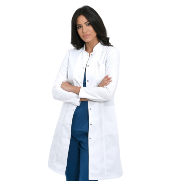 Женский медицинский халат BS813 имеет приталенный крой выше колена и длинные рукава. Рельефные вертикальные швы по спинке и полочке изделия зрительно вытянут силуэт. Ярким акцентом в данной модели выступает тонкий кант. Он обрамляет воротник, манжеты рукавов и карманы. Воротник-стойка придают образу строгости и элегантности.