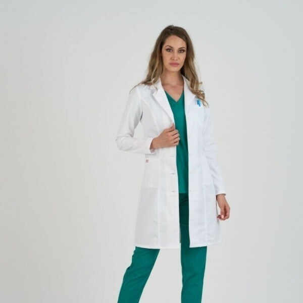 Халат приталенный с воротником-лацканом от сербского бренда BTS имеет полуприталенный силует. Модель дополнена тремя карманами: два накладных и один нагрудный. Рукав длинный. Длина: до середины колена. Застежка на пуговицы.