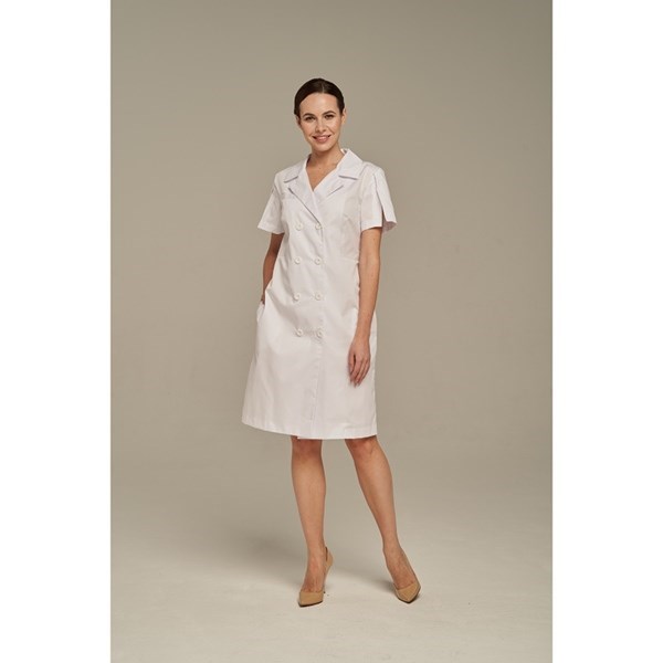 Женский медицинский халат бренда Dr.Nice имеет красивый короткий рукав с разрезом, отложной воротник пиджачного типа и карманы в боковых швах. Изделие застегивается спереди на пуговицы.