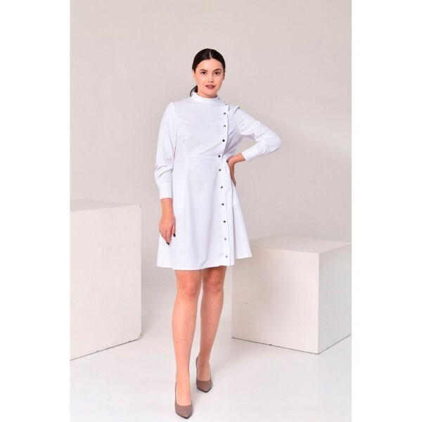 Медицинский халат белого цвета от бренда Mariita выполнен в приталенном фасоне с расклешённой юбкой. Модель имеет укороченный рукав с манжетами на кнопках, воротник-стойку, боковые карманы и ассиметричную застежку на металлических кнопках.