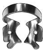 Кламп № 14А с челюстными изогнутыми по плоскости в виде коронки , для моляров с сильно разрушенной коронковой частью или с плотностью разрушенной мезиальной стенкой.