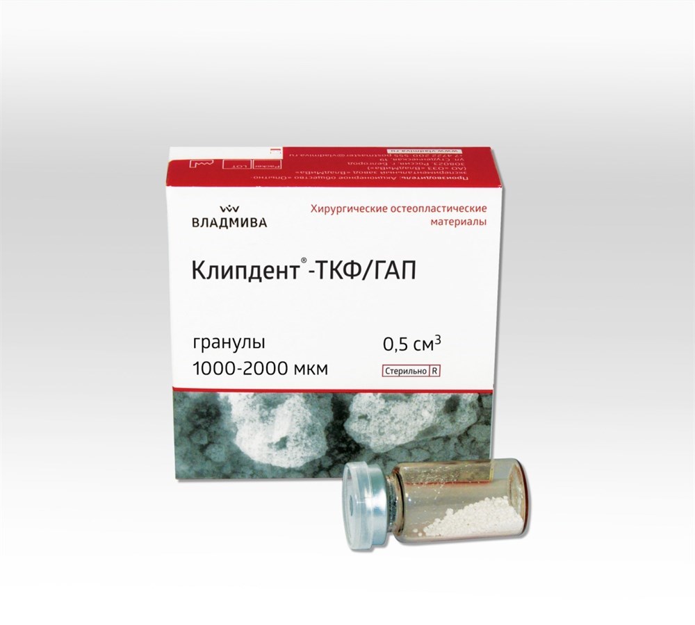 Гранулы для костной регенерации «Клипдент»: на основе чистой фазы β‑трикальцийфосфата; на основе β – трикальцийфосфата (60 %) / гидроксиапатит (40 %), изготовлены в результате спекания синтетического сырья, не содержат веществ животного происхождения, биологически совместимы с тканями организма. Гранулы обладают высокой микро-, макро- и межгранулярной пористостью, что создаёт идеальные условия для восстановления кости.