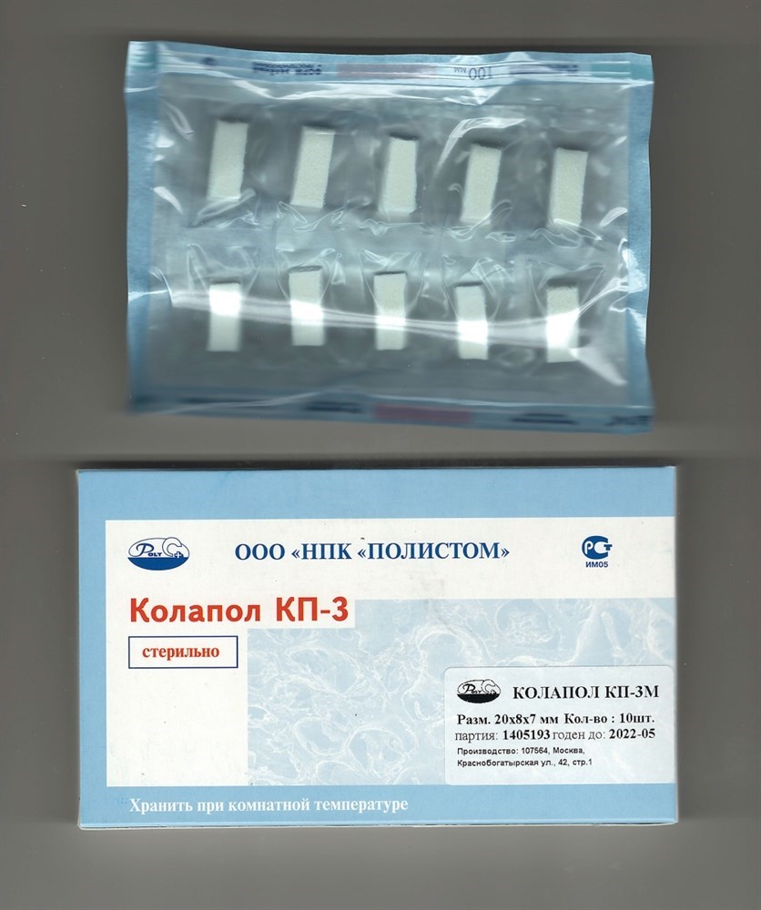 Колапол КП-3М 10 фрагментов (20 х 8 х7 мм) содержит метронидазол. Для заполнения различных костных полостей (цистэктомия, резекция корня), синус-лифтинга.