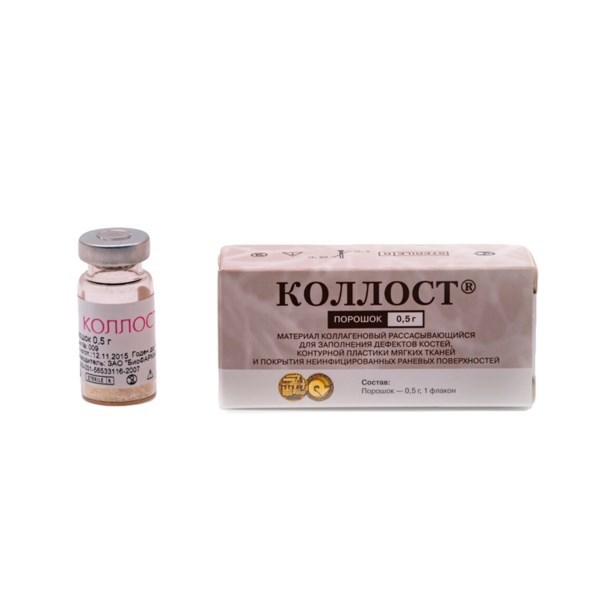 «КОЛЛОСТ» порошок — медицинское изделие, содержащее коллаген I типа нативный нереконструированный из шкуры крупного рогатого скота. Мелкодисперсный порошок белого или бледно-желтого цвета. Выпускается в форме порошка — 0,2 г / 0,5 г / 0,7 г / 1,0 г / 2,0 г / 10,0 г во флаконе/бутыли. Для стерилизации «КОЛЛОСТ» применяют метод радиационной стерилизации. Стерилизующая доза для порошка должна быть 15,6 кГр. Максимальная доза для порошка не должна превышать 40 кГр.