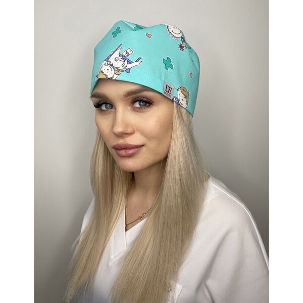 Медицинский колпак бирюзового цвета с веселым принтом используется как защита от различных неблагоприятных воздействий (грязь, влага, пыль и другие), а также при соблюдении гигиенических норм. Объем колпака регулируется шнуром сзади.