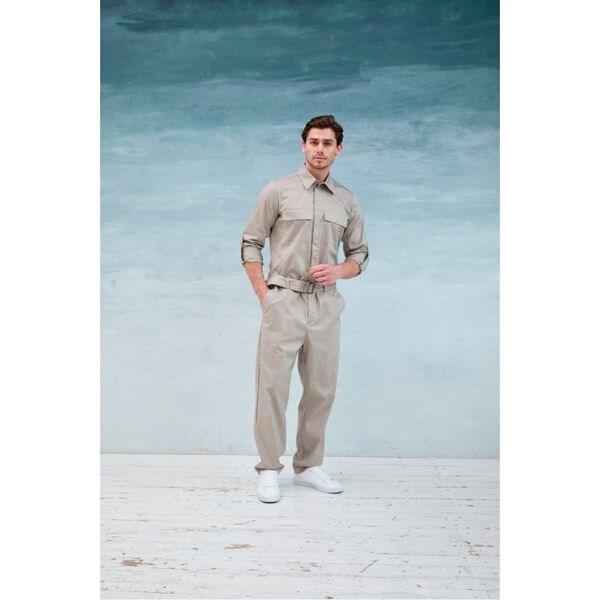 Универсальный мужской комбинезон с длинными рукавами, которые можно укоротить до длины 3⁄4 , закрепив их хлястиком. Верхняя часть изделия застегивается на кнопки, на груди расположены два дополнительных кармана. В комплекте идет пояс с пряжкой.