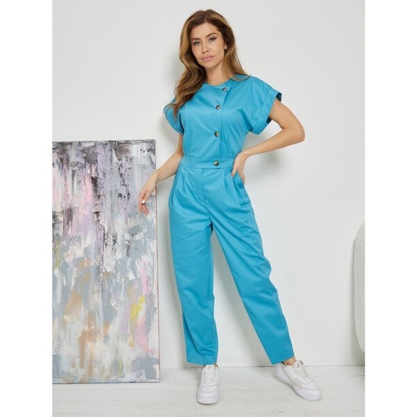 Женская комбинезон с коротким рукавом выполнен в стильном и оригинальном дизайне. Модель имеет ассиметричную застежку на пуговицы спереди, приталенный силуэт и два боковых кармана.