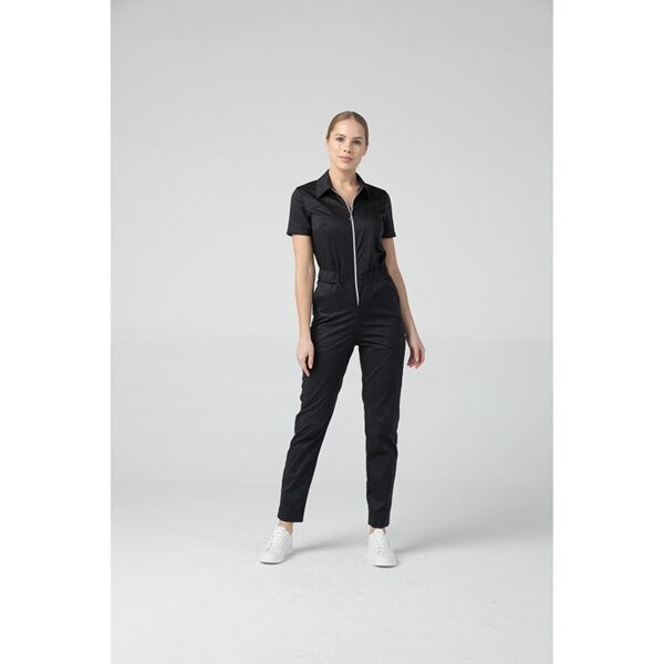 Женский медицинский комбинезон Dr.Nice выполнен в оригинальном стиле с застежкой-молнией спереди, отложным воротником и коротким рукавом. Модель дополняет два боковых кармана и резинка по линии талии.