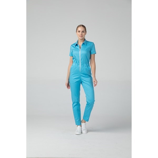 Женский медицинский комбинезон Dr.Nice выполнен в оригинальном стиле с застежкой-молнией спереди, отложным воротником и коротким рукавом. Модель дополняет два боковых кармана и резинка по линии талии.