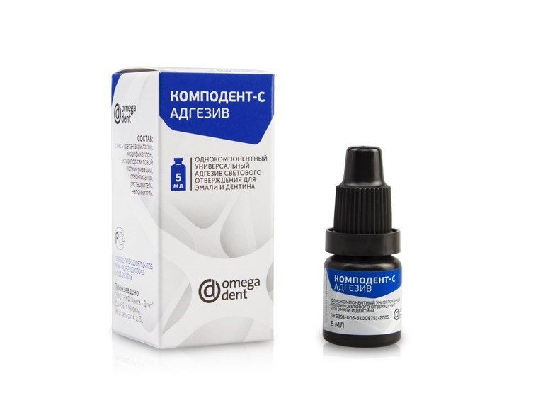 "КОМПОДЕНТ-С" Адгезив - это светоотверждаемая универсальная адгезивная система V поколения, объединяющая в себе свойства праймера и бонда в одном флаконе для применения в технике тотального протравливания.