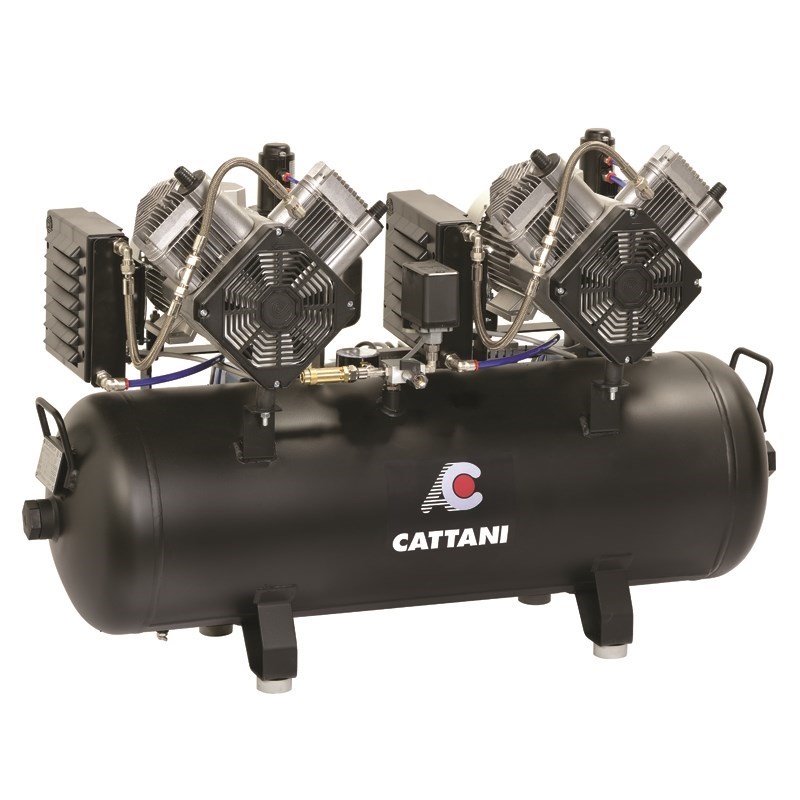 Компрессор стоматологический CATTANI типа тандем, на 7 стоматологических установок. Безмасляный стоматологический компрессор оснащенный двумя трехцилиндровыми к двигателями и 2 осушителями, системой фильтров и охлаждения.