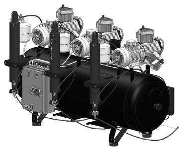 Компрессор стоматологический безмасляный с тремя 3х-цилиндровыми двигателями (3х-фазный), оснащенный тремя осушителями.