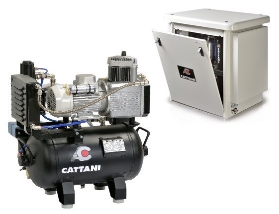 Компрессор стоматологический CATTANI на 1 установку, в металлическом шумозащитном кожухе - одноцилиндровый, безмасляный, оборудованный системой фильтров и охлаждения, обеспечивает подачу сжатого сухого воздуха наивысшего качества и чистоты.