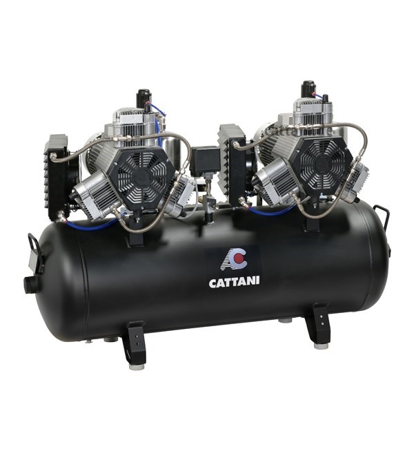 Компрессор стоматологический безмасляный с двумя 6ти-цилиндровыми двигателями (3х-фазные), оснащённый четырьмя осушителями.