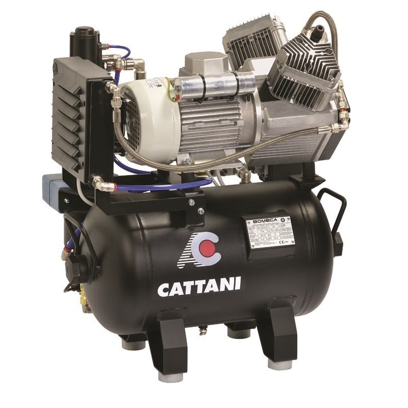 Компрессор стоматологический CATTANI на 2 установки-двухцилиндровый, безмасляный, оборудованный осушителем, системой фильтров и охлаждения, обеспечивает подачу сухого сжатого воздуха наивысшего качества и чистоты на рабочее место врача.