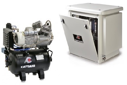 Компрессор стоматологический CATTANI на 2 установки в металлическом шумозащитном кожухе -двухцилиндровым, безмасляный, оборудованный осушителем, системой фильтров и охлаждения, обеспечивает подачу сухого сжатого воздуха наивысшего качества и чистоты на рабочее место врача.