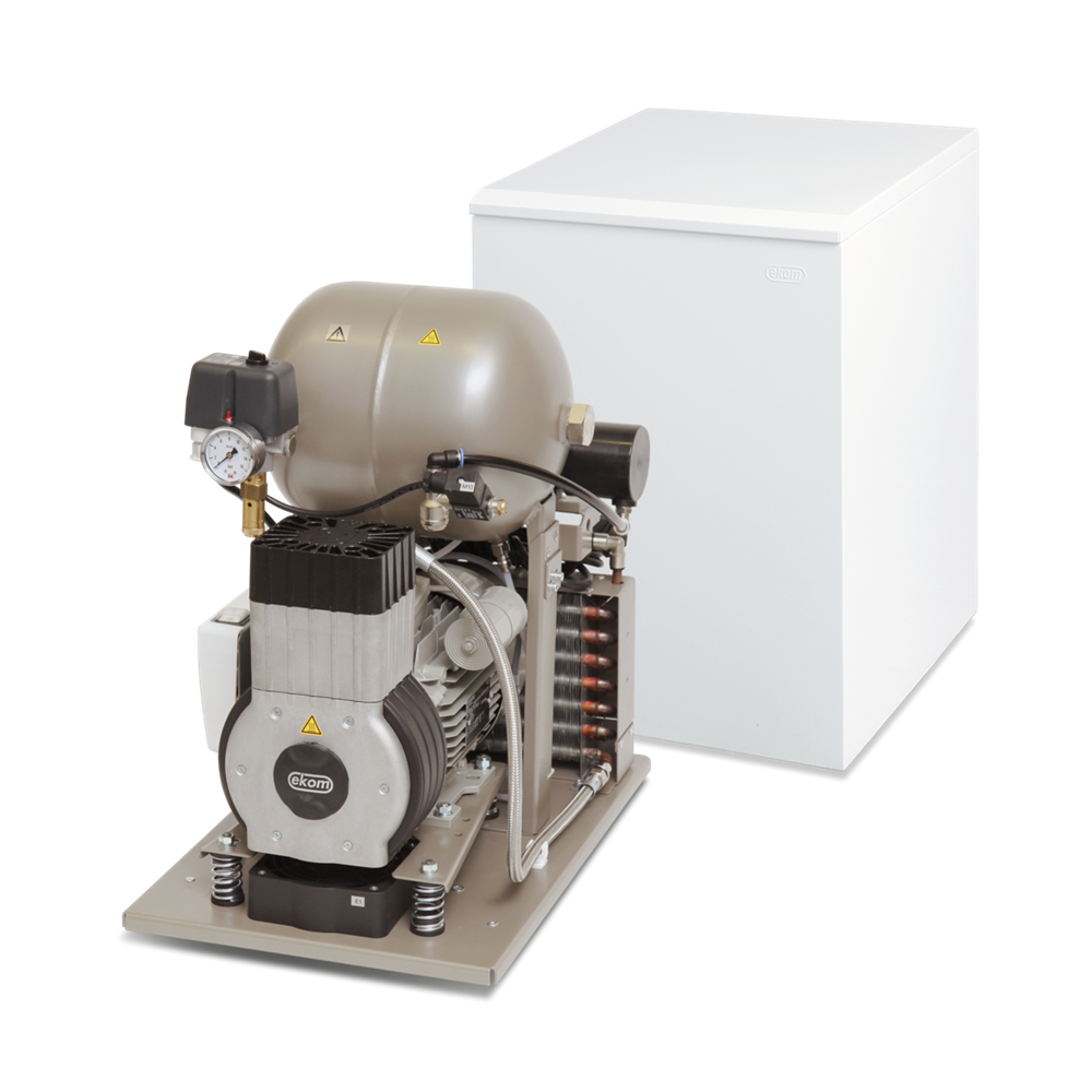 Безмасляный компрессор EKOM серии DK50-10 S является источником чистого, безмасляного сжатого воздуха, предназначенного для приведения в движение медицинских приборов и устройств. По своим техническим параметрам и размерам резервуара воздуха объемом в 10 л он является очень удобным для питания медицинских приборов или оборудования зуботехнической лаборатории. Сжатый воздух, производимый безмасляным компрессором указанного типа, обеспечивает высокую степень соблюдения гигиены и качества труда врача, не создавая, притом, вокруг себя среду, содержащую чужеродные вещества.
