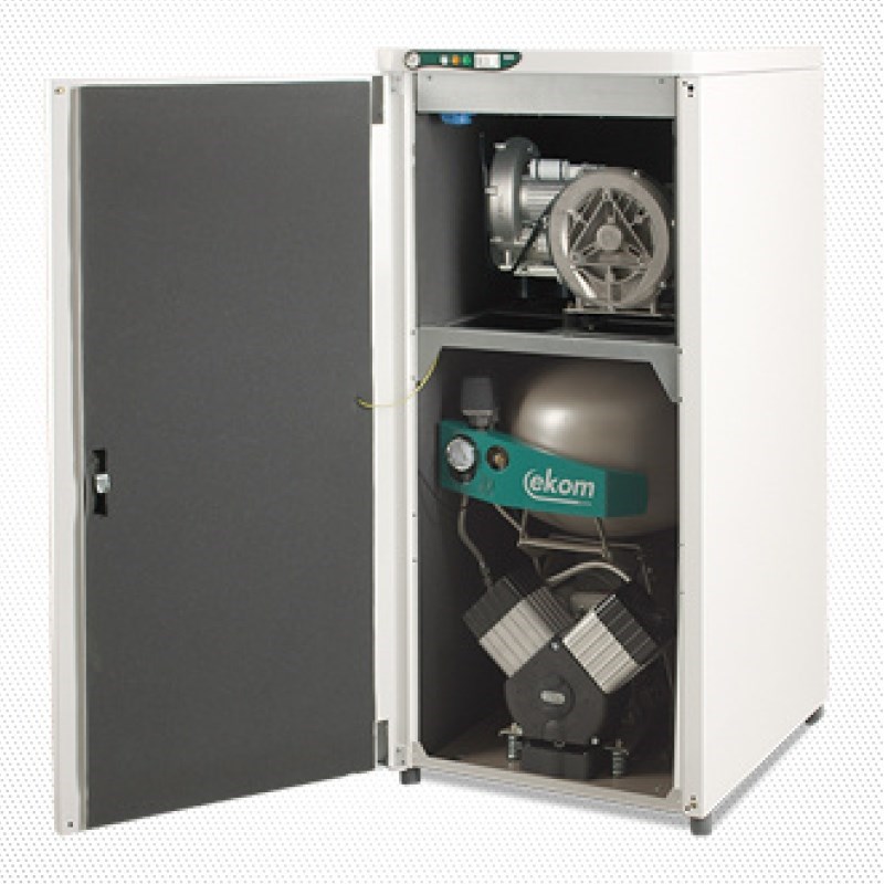 Компрессор с отсасывателем в одном корпусе Безмаслянный компрессор EKOM с двумя отсасывающими агрегатми серии DUO 2 являются источниками чистого сжатого воздуха, несодержащего масляных капельных включений, который предназначен для приведения в действие зубоврачебных приборов и устройств, а также для создания пониженного давления в отсасывающем агрегате. Благодаря своим параметрам и размерам резервуара воздуха объемом 25 л и наличию отсасывающего агрегата, компрессор этого типа может обслуживать два комплекса стоматологических устройств, которые оборудованы вытяжным блоком. Сжатый воздух, производимый безмасляным компрессором указанного типа, обеспечивает высокую степень соблюдения гигиены и качества труда стоматолога, не создавая, притом, вокруг себя среду, содержащую чужеродные вещества. По своему дизайну компрессор этого типа являются очень удобным для применения непосредственно в зубоврачебном кабинете, органично вписываясь в их интерьер. DUO 2 - для двух стоматологических установок (компрессор DK50 2V с двумья отсасывающими агрегатами)