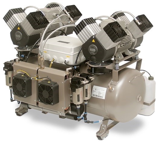 Безмасляный компрессор EKOM серии DK50 2x4VR/110/M является источником чистого, безмасляного сжатого воздуха, предназначенного для приведения в движение зубоврачебных приборов и устройств. Благодаря своим параметрам и размерам резервуара воздуха объемом 110 л, компрессор этого типа является очень удобным для применения к обслуживанию оборудования в зуботехнических лабораториях.