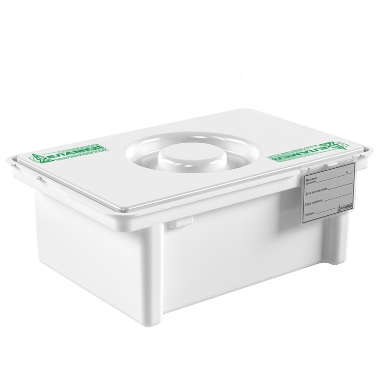 Состоит из корпуса в виде емкости прямоугольной формы, перфорированного поддона, пластины для погружения в раствор лёгких изделий, крышки и карманов (2 шт.).