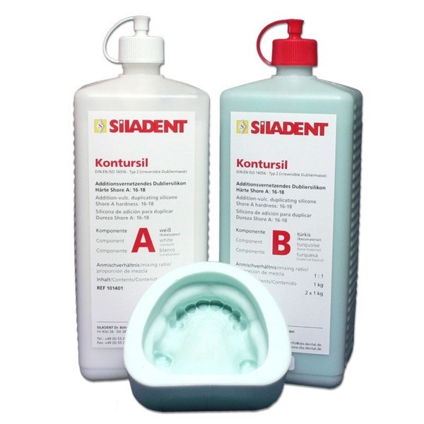 Силикон для дублирования дополнительного отверждения Kontursil 1:1, компонент A + B. Предпочтительно подходит для дублирования в традиционной кюветной технике дублирования.