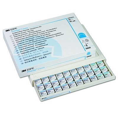 3М Protemp Crown - стартовый набор, 42 коронки в коробке (каждая в индивидуальной упаковке) размеры: 6 шт верхний моляр (большая), 6 шт верхний моляр (маленькая), 6 шт нижний моляр (большая), 6 шт нижний моляр (маленькая), 4 шт верхний премоляр (маленькая), 4 шт нижний премоляр, 3 шт клык большой, 3 шт клык маленький; шаблон для подбора размера коронки (2 упаковки по 10 шт.).