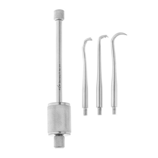 Кончики направляющего цилиндра и периметр груза имеют ретенционный узор для более надёжного удержания рукой в одноразовой латексной перчатке. Сменные насадки: серповидная тонкая для узких межзубных промежутков; в виде лезвия кюреты для опоры под промежуточные части мостовидного протеза; прямоугольная с допольнительными ретенционными насечками для участков с хорошим доступом под край ортопедической конструкции.